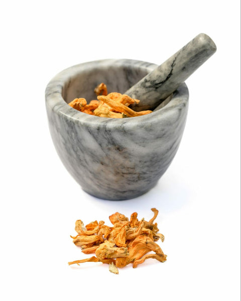 Cordyceps (Cordyceps Militaris) or (Cordyceps Sinensis) is a fungus that lives on certain caterpillars, originally discovered in the high tops of the Himalayas. Local herders discovered cordyceps mushroom benefits while observing their cattle consuming these mushrooms and showing an enhanced vigor and vitality. For centuries, the benefits of cordyceps mushrooms have been recognized as a powerful healing mushroom in Chinese and Tibetan medicine. There has been some interesting research conducted on cordyceps mushrooms showing that it helps with lung function, energy, and intense exercise. Like all of the functional mushroom supplements we use for our products, cordyceps for dogs and cats can promote immunomodulation.
